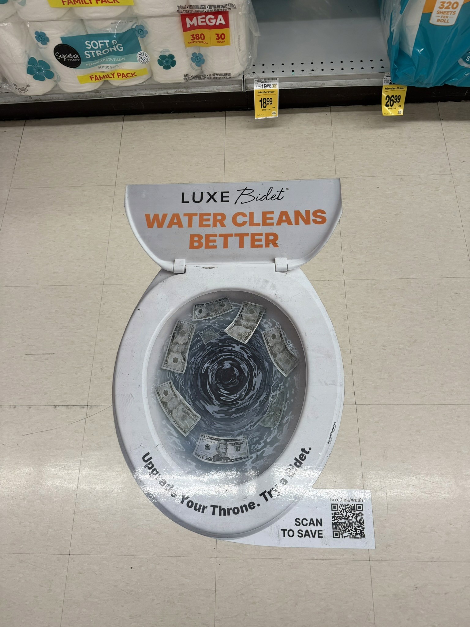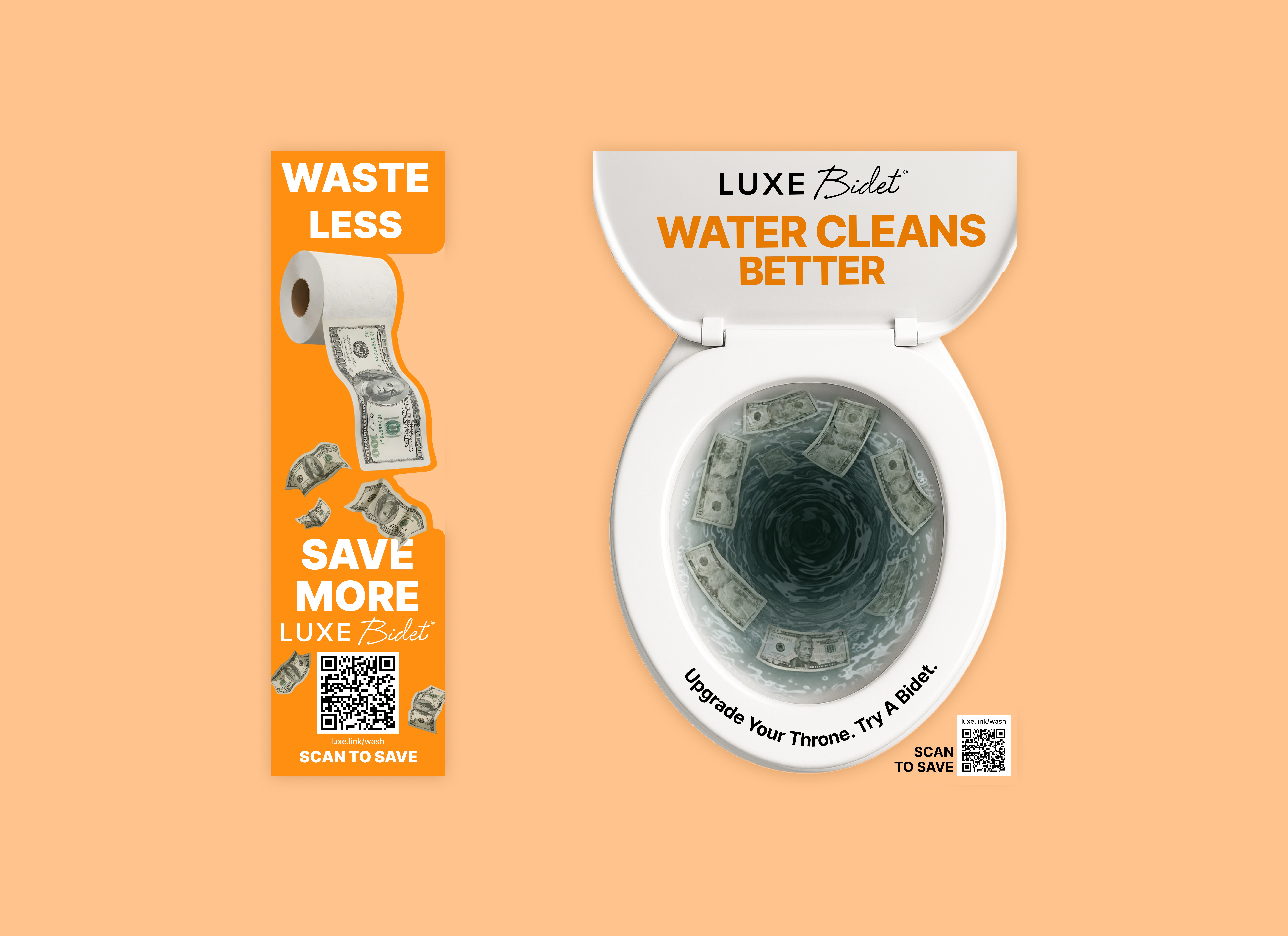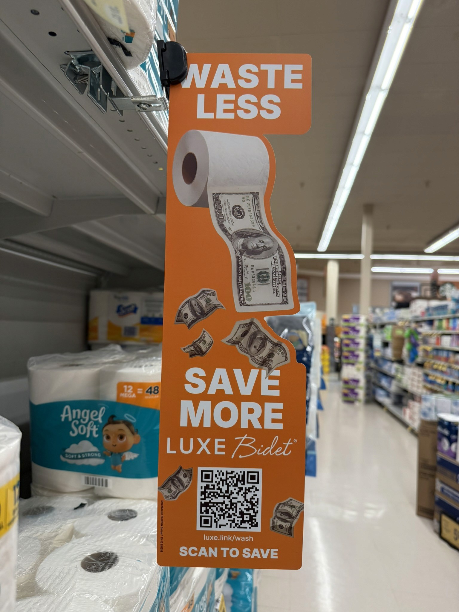 LUXE Bidet required high-visibility, scan-first in-store displays that could communicate value at a glance within crowded grocery aisles. The challenge was designing shelf and floor signage that balanced brand clarity, legibility at distance, and print constraints for a nationwide grocery retail rollout.